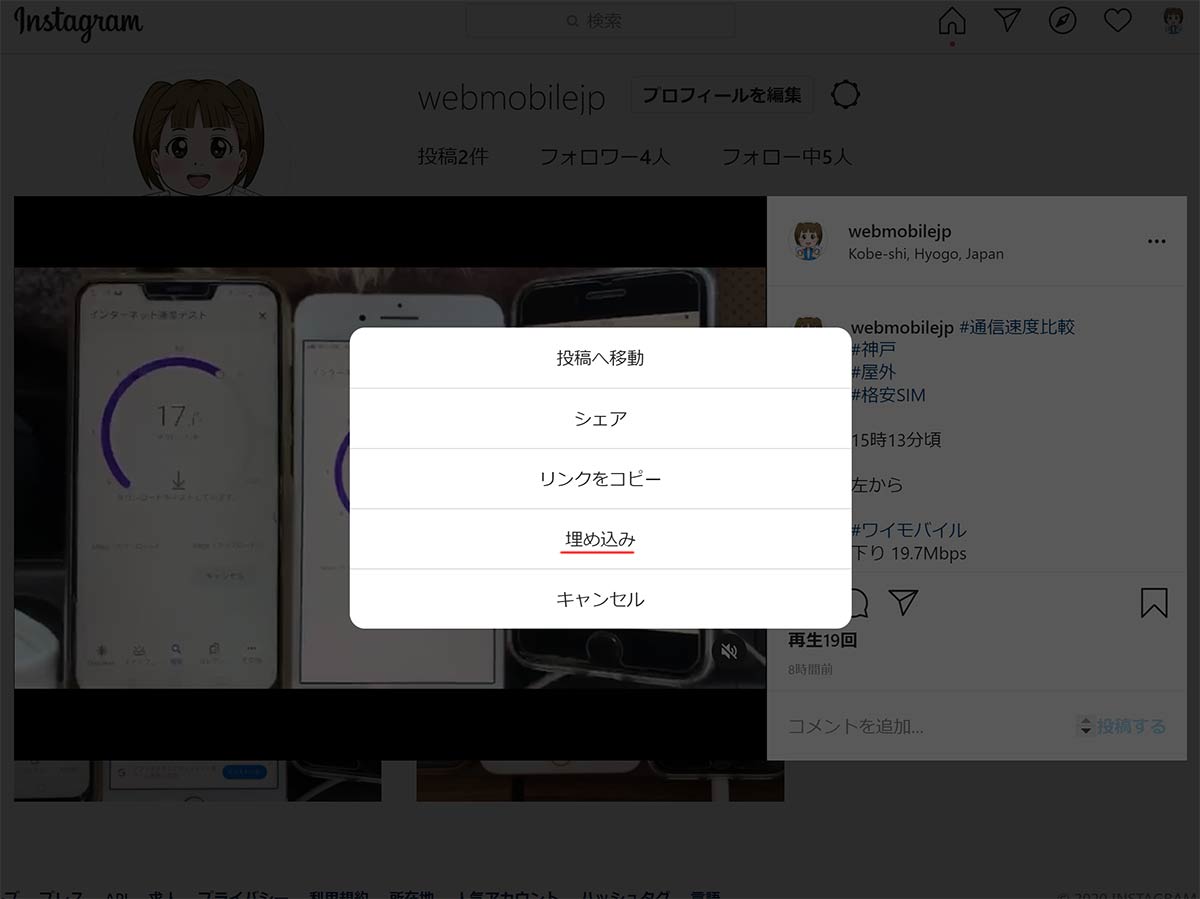 ブラウザ版インスタグラム(PC・スマホ)で”埋め込みコード”は表示できます。アプリではできません。