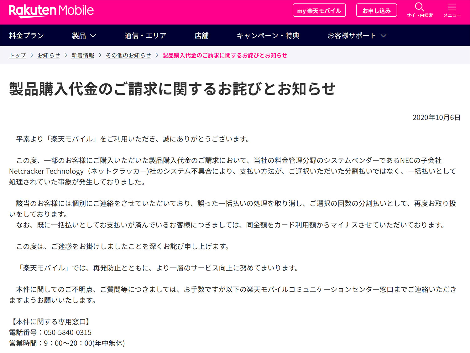 楽天モバイルで分割払いで買ったスマホが一括払いで請求される件、やはり楽天モバイル側のトラブルでした。でしょ?