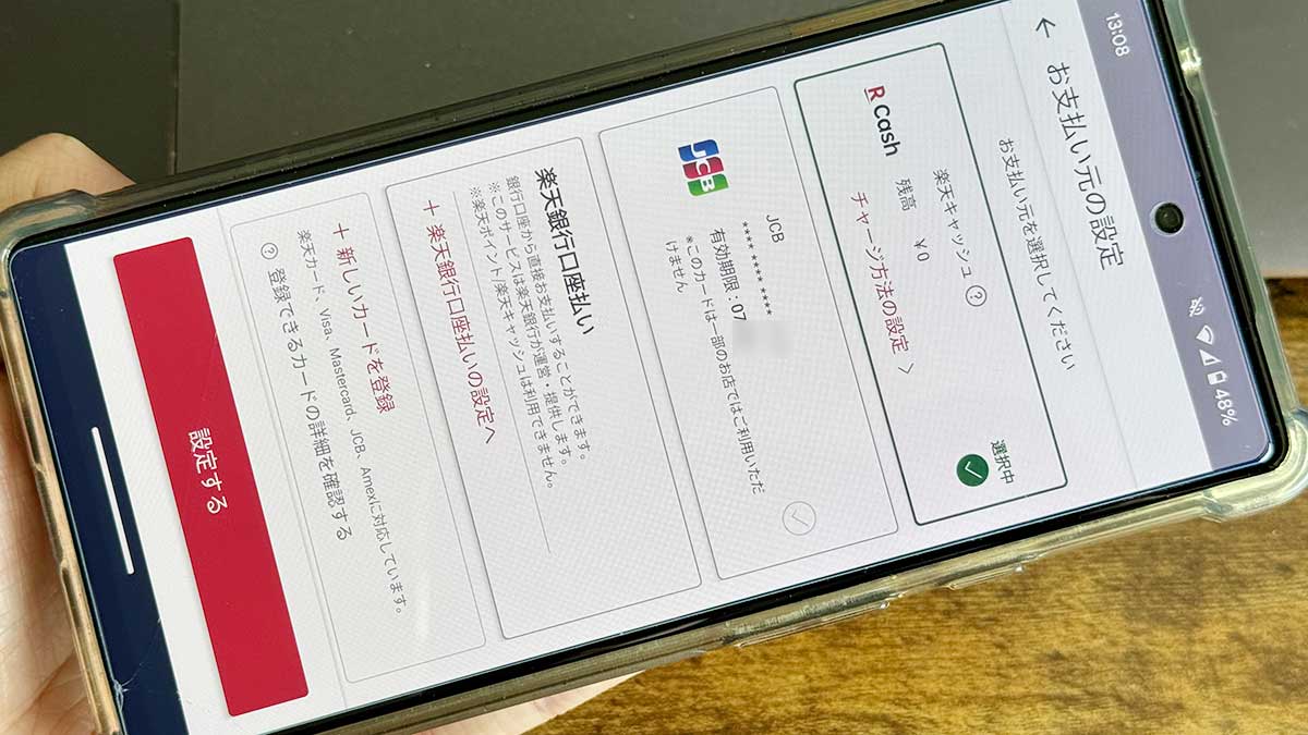 ”お支払い元の設定”で、クレジットカードまたは楽天銀行口座を登録します。
